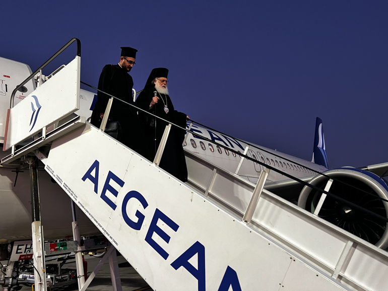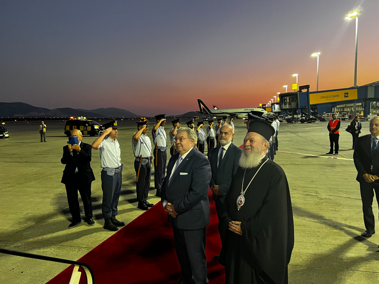 Τον Αρχιεπίσκοπο κ. Αναστάσιο, και την συνοδεία του, υποδέχτηκαν στον Διεθνή Αερολιμένα Αθηνών «Ελευθέριος Βενιζέλος» – με τη συνοδεία αγήματος της Ελληνικής Αστυνομίας – ο Αντιπρόεδρος της Οργανωτικής Επιτροπής του Συνεδρίου, Μητροπολίτης Χαλκίδος κ. Χρυσόστομος, ο Γενικός Διευθυντής της Ε.Μ.Υ.Ε.Ε. και Γραμματέας της Οργανωτικής Επιτροπής, κ. Αλέξανδρος Κατσιάρας και εκ μέρους της Πολιτείας, ο Γενικός Γραμματέας Αποδήμου Ελληνισμού και Δημόσιας Διπλωματίας κ. Γιάννης Χρυσουλάκης.