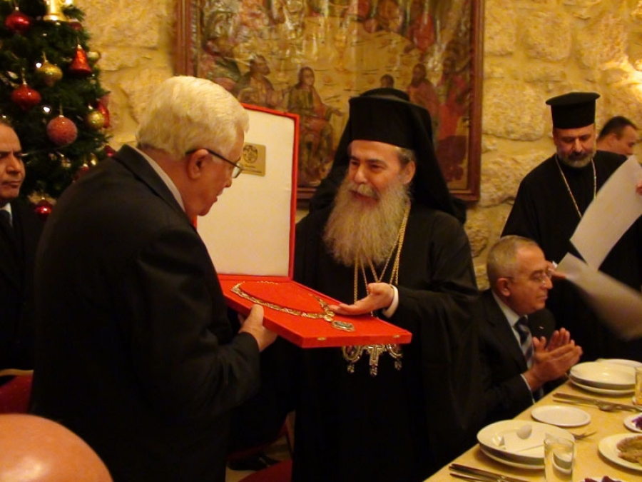 Τον «Μεγαλόσταυρο του Παναγίου Τάφου», ανώτατη τιμητική διάκριση του Πατριαρχείου Ιεροσολύμων, απένειμε χθες στον Παλαιστίνιο Πρόεδρο, ο Πατριάρχης Ιεροσολύμων, μαζί με το «Περιδέραιο της Ειρήνης».