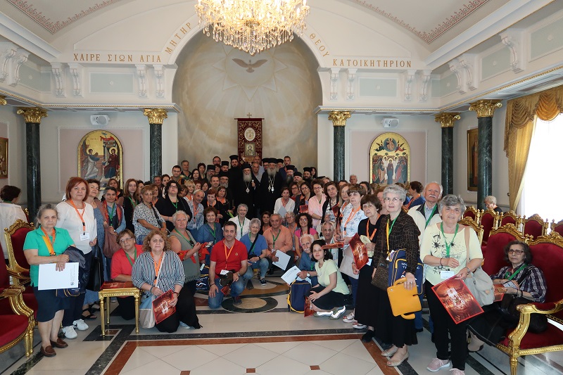 Την πρώτη μέρα Τετάρτη 5 Ιουνίου, τον Σεβασμιώτατο , τους 10 Ιερείς και τους 90 προσκυνητές εδέχθη με εγκαρδιότητα και περισσή αγάπη η Α.Θ.M. ο Πατριάρχης Ιεροσολύμων κ. Θεόφιλος ο Γ’, ο οποίος τους καλωσόρισε στην αίθουσα του Θρόνου του Πατριαρχείου και για αρκετή ώρα τους ωμίλησε για τα Ιερά προσκυνήματα, τα οποία ακολουθούν την πορεία τους μέσα στην ιστορία και σημαδεύεται από την παρουσία της Εκκλησίας και μάλιστα του Ελληνορθοδόξου Πατριαρχείου, το οποίο αποτελεί σημείο αναφοράς για όλο τον Χριστιανικό κόσμο. Οι εκεί υπηρετούντες Πατέρες προσφέρουν ανεκτίμητο έργο στην Εκκλησία και στην Ελλάδα και είναι έτοιμοι αντί παντός τιμήματος ακόμη και αυτής της ζωής τους, να υπερασπιστούν τα δίκαια του Πατριαρχείου. Παντού κυματίζει η Ελληνική σημαία. Σε όλα τα Μοναστήρια και τα προσκυνήματα υπάρχουν Έλληνες κληρικοί. Σε όλες τις Ιερές ακολουθίες χρησιμοποιείται η Ελληνική γλωσσά. Στα Ιεροσόλυμα, στην έρημο, στην Παλαιστίνη, στο Ισραήλ βλέπεις παντού την Ελλάδα. Οι δυσκολίες είναι πολλές, η αγάπη τους όμως είναι μεγάλη και υπερπηδά τα εμπόδια. Η ανησυχία του Πατριάρχου και όλων των Πατέρων της Αγιοταφικής Αδελφότητος, είναι το μέλλον των Προσκυνημάτων και των Μονών, διότι οι θεματοφύλακες Πατέρες μεγαλώνουν στην ηλικία και η καθημερινή προσευχή τους είναι να στείλει ο Θεός ανθρώπους με αγάπη και Θείο ζήλο, ώστε να επανδρωθούν οι Μονές και έτσι να συνεχίσουν τα Ιερά Προσκυνήματα την πορεία τους μέσα στο χρόνο, συνεχίζοντας την σωτήριο προσφορά τους.