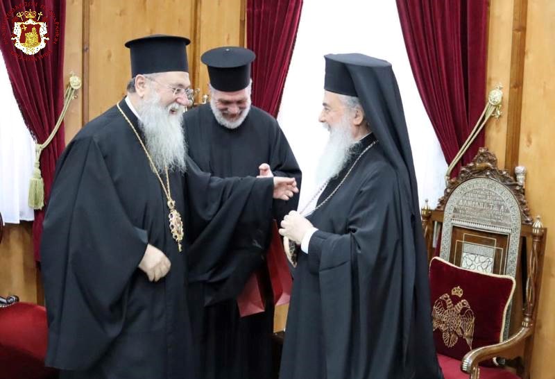 γ. Ἐπιτροπή τῆς Ἐκκλησίας τῆς Ἑλλάδος ἀποτελουμένη ἐκ τοῦ Σεβασμιωτάτου Μητροπολίτου Κορίνθου κ. Διονυσίου καί τοῦ κ. Κατσιάρα ἐπεσκέφθησαν τόν Μακαριώτατον καί προσεκάλεσαν Αὐτόν ἐξ ὀνόματος τῆς Ἐκκλησίας τῆς Ἑλλάδος διά συμμετοχήν εἰς τήν τελετήν συμπληρώσεως ἑκατονταετίας ἀπό τῆς ἐκδόσεως τοῦ περιοδικοῦ «Θεολογία» ὑπό τοῦ Ἁγιοταφίτου Ἀρχιεπισκόπου Ἀθηνῶν ἀοιδίμου Χρυσοστόμου Παπαδοπούλου.