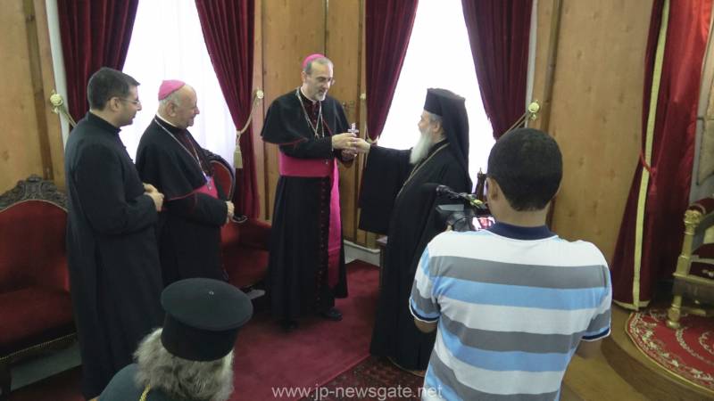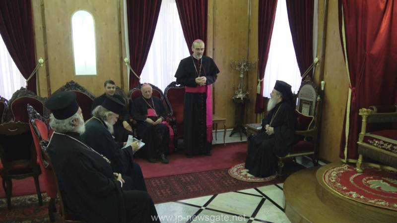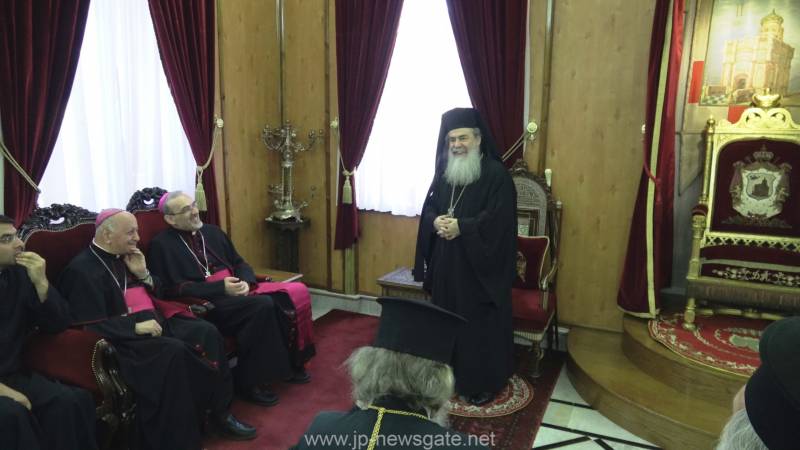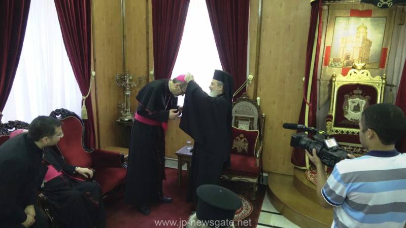 Ο νέος Λατίνος Πατριάρχης κατά την επίσκεψή του στα Ιεροσόλυμα έγινε δεκτός από την Πατριάρχη Ιεροσολύμων κ. Θεόφιλο, ο οποίος συνοδευόταν από Αγιοταφίτες Πατέρες.