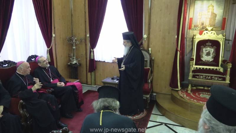 Ἀπαντῶν ὁ Μακαριώτατος ἐξέφρασε τήν ἰκανοποίησιν αύτοῦ διά τήν καλήν συνεργασίαν αὐτοῦ μετά τοῦ Μακαριωτάτου Pierbattista Pizzaballa, διαρκούσης τῆς διακονίας αὐτοῦ εἰς τήν Ρωμαιοκαθολικήν Ἐκκλησίαν ὡς Κουστωδοῦ τῆς Ἁγίας Γῆς ἐπί τρεῖς συνεχεῖς θητείας καί διά τό ὅτι ἡ συνεργασία αὕτη θά συνεχισθῇ προκειμένου νά θεραπευθοῦν αἰ πληγαί τοῦ παρελθόντος καί νά ἀντιμετωπισθοῦν τά προβλήματα τῶν Χριστιανῶν, τά ὁποῖα δημιουργοῦν αἰ καταστάσεις τοῦ αἰῶνος μας.