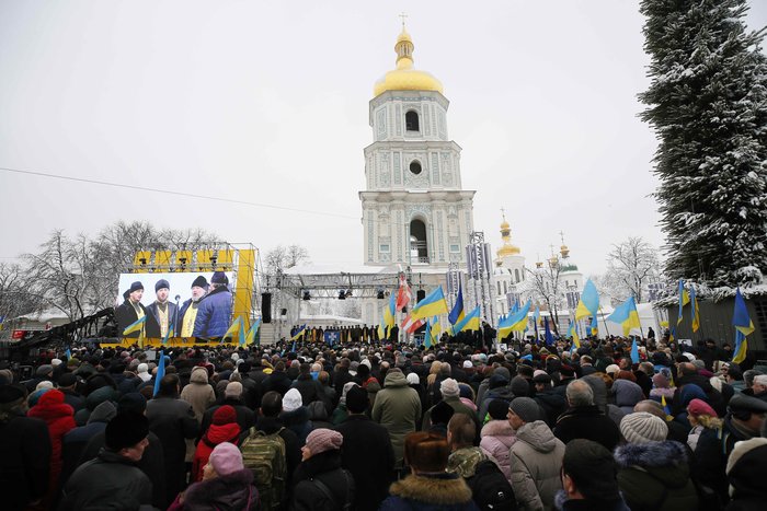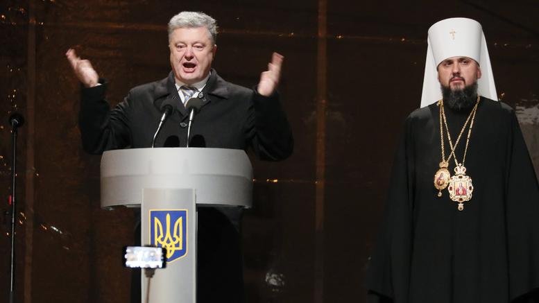Από την πλευρά του ο Πρόεδρος Πέτρο Πoροσένκο ανακοίνωσε τη δημιουργία της «ουκρανικής τοπικής ορθόδοξης αυτοκέφαλης εκκλησίας» στο συγκεντρωμένο πλήθος, λέγοντας χαρακτηριστικά «Συγχαρητήρια σε όλους για τη δημιουργία της τοπικής αυτοκέφαλης ορθόδοξης εκκλησίας της Ουκρανίας, η οποία μόλις έλαβε χώρα στον καθεδρικό ναό της Αγίας Σοφίας».