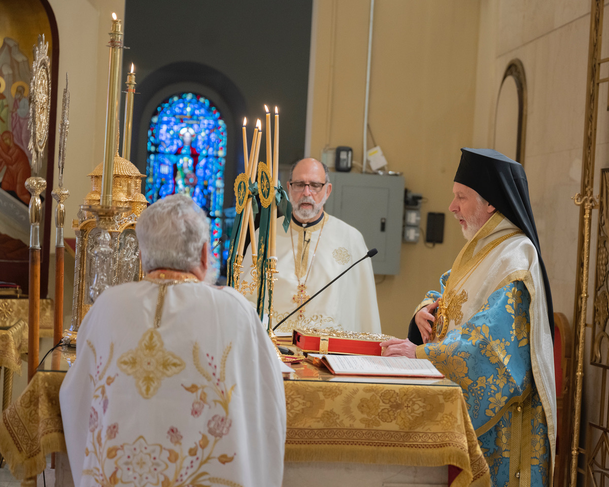 Στην ομιλία του, ευχαρίστησε τονΑρχιεπίσκοπο Αμερικής κ. Ελπιδοφόρο, για την τιμητική του πρόσκληση, να συμμετάσχει ως εισηγητής στο διήμερο συνέδριο της Θεολογικής Σχολής, καθώς και τον Μητροπολίτη Βοστώνης κ. Μεθόδιο, με την κανονική άδεια του οποίου τέλεσε την ευχαριστιακή σύναξη, με τη συμμετοχή του προϊσταμένου του ναού Αιδ. Πρωτοπρεσβυτέρου κ. Αθανασίου Τσινίνη και του εξ Ελλάδος επισκέπτου Αιδ. κ. Βασιλείου. Τους ύμνους έψαλαν τρεις φοιτητές της Θεολογικής Σχολής του Τιμίου Σταυρού.