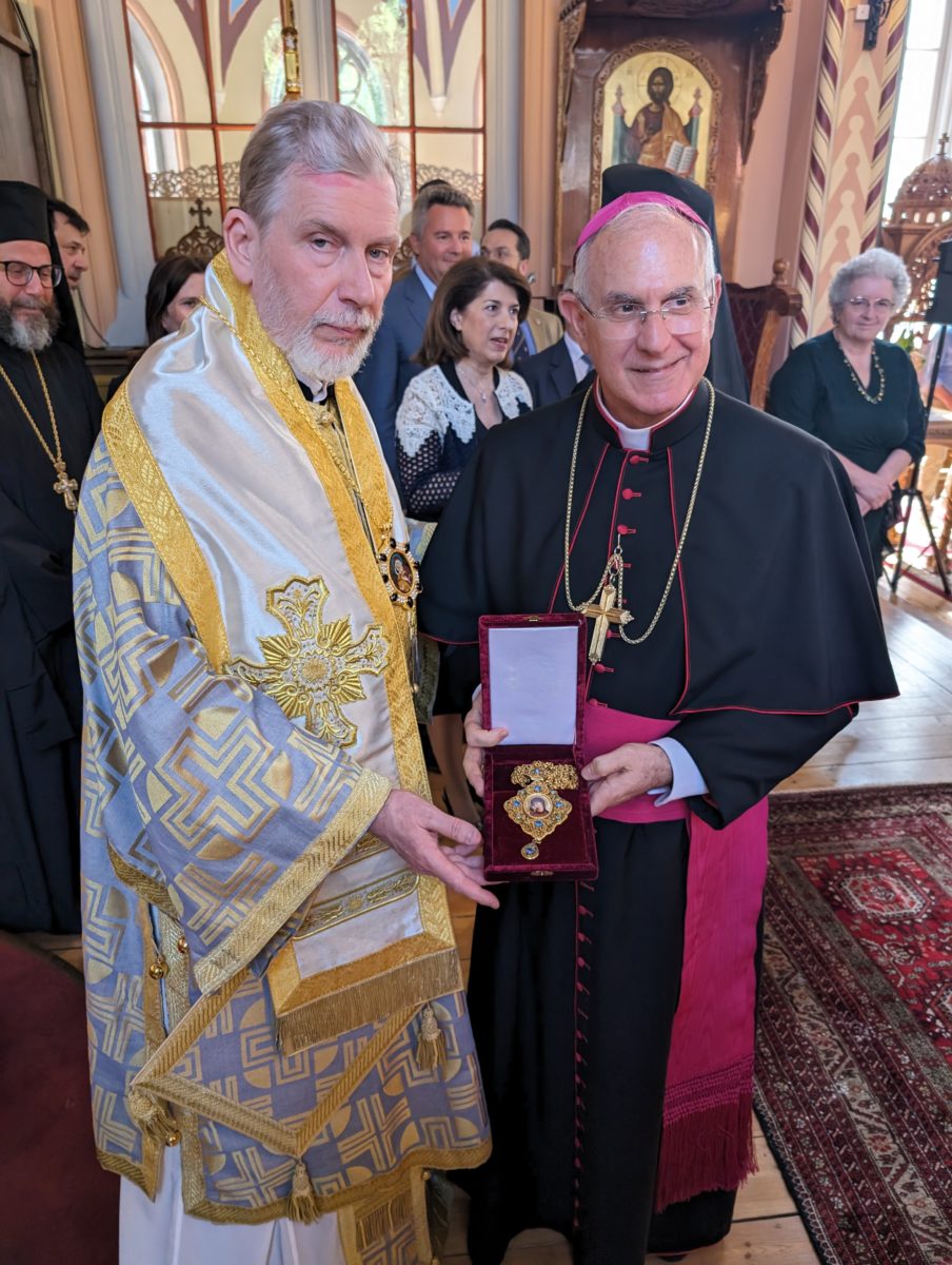 Στην ομιλία του, οΝούτσιος ευχαρίστησε τον Ποιμενάρχη των Σκανδιναυϊκών Χωρών για την τιμητική παρουσία του, έχοντας ήδη δώσει ο ίδιος το παρών στο Αρχιερατικό Συλλείτουργο που τελέστηκε στον Καθεδρικό Ναό Αγίου Γεωργίου Στοκχόλμης, την Κυριακή, 26 Μαΐου 2024, με την συμπλήρωση δεκαετίας από της αναλήψεως των ποιμαντορικών καθηκόντων του Ποιμενάρχου, στον οποίο προσέφερε ως δώρο αρχιερατικό εγκόλπιο.