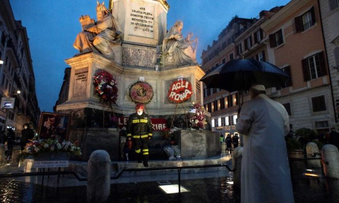 Ο ποντίφικας στη συνέχεια προσευχήθηκε και ζήτησε από την Παρθένο να προστατέψει τους κατοίκους της Ρώμης και όσους, σε ολόκληρο τον κόσμο, αντιμετωπίζουν την τρομερά δύσκολη κατάσταση που έχει δημιουργήσει η πανδημία του κορονοϊού.