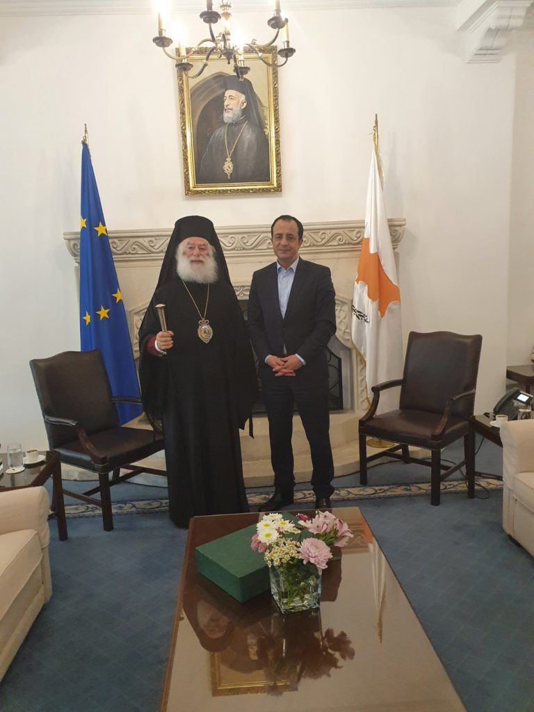 Την Δευτέρα 12 Ιουνίου ε.έ., στα πλαίσια της επίσημης επισκέψεώς του στην Κύπρο, η Α.Θ.Μ ο Πάπας και Πατριάρχης Αλεξανδρείας και πάσης Αφρικής κ.κ. Θεόδωρος Β’, συνοδευόμενος από τον Πατριαρχικό εν Κύπρω Έξαρχο Θεοφιλέστατο Επίσκοπο Νιτρίας κ. Νικόδημο, είχε εγκάρδια συνάντηση με τον Εξοχότατο Πρόεδρο της Κυπριακής Δημοκρατίας κ. Νίκο Χριστοδουλίδη, τον οποίο συνεχάρη για την εκλογή του στην θέση του Προέδρου της Κυπριακής Δημοκρατίας.