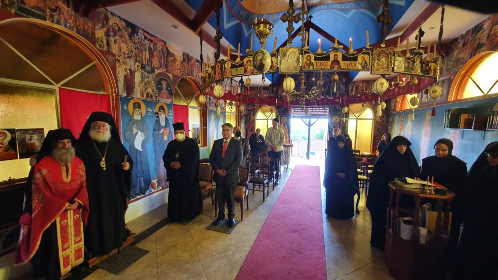 Τον Μακαριώτατο υποδέχθηκαν, ο Σεβασμ. Μητροπολίτης Ιωαννουπόλεως και Πρετορίας κ. Δαμασκηνός, ο Γέροντας της αδελφότητας, Πανοσιολ. Αρχιμ. κ. Απόστολος και η Γερόντισσα μετά της συνοδείας αυτής.