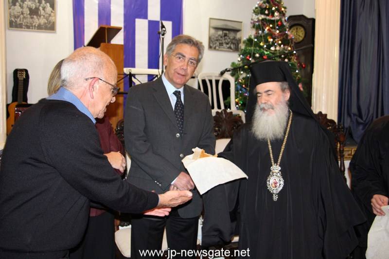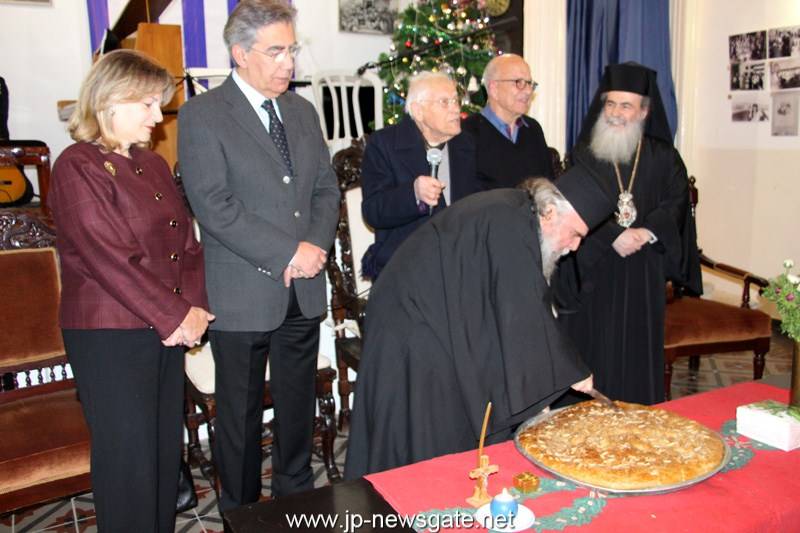 Τό ἑσπέρας τοῦ Σαββάτου, 24ης Ἰανουαρίου/ 6ης Φεβρουαρίου 2016, ἡ Α.Θ.Μ. ὁ Πατήρ ἡμῶν καί Πατριάρχης Ἱεροσολύμων κ.κ. Θεόφιλος, συνοδευόμενος ὑπό τοῦ Πατριαρχικοῦ Ἐπιτρόπου Σεβασμιωτάτου Μητροπολίτου Καπιτωλιάδος κ. Ἡσυχίου, τοῦ Γέροντος Ἀρχιγραμματέως Σεβασμιωτάτου Ἀρχιεπισκόπου Κωνσταντίνης κ. Ἀριστάρχου καί τοῦ Σεβασμιωτάτου πρῴην Μητροπολίτου Ζάμπιας κ. Ἰωακείμ, ηὐλόγησε τήν τελετήν τῆς κοπῆς τῆς βασιλόπιττας εἰς τήν Λέσχην τῆς Ἑλληνικῆς παροικίας, κειμένην εἰς τήν δυτικήν Ἱερουσαλήμ πλησίον τοῦ Ἑλληνικοῦ Γενικοῦ Προξενείου, καί οὖσαν δωρεάν τοῦ μακαριστοῦ Σκευοφύλακος τοῦ Παναγίου Τάφου Ἀρχιμανδρίτου. Εὐθυμίου πρός τήν Ἑλληνικήν Παροικίαν.