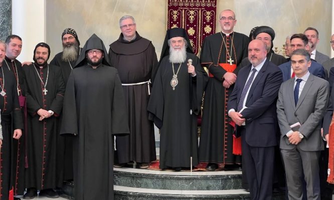 Οἱ Πατριάρχαι καί οἱ Προκαθήμενοι τῶν Ἐκκλησιῶν εἰς Ἱεροσόλυμα συνηντήθησαν μετ’ ἐξοχωτάτων Πρέσβεων, Γενικῶν Προξένων καί Ἐκπροσώπων Διπλωματικῶν Ἀποστολῶν, διά νά συσκεφθοῦν διά τάς προκλήσεις, αἱ ὁποῖαι παρουσιάζονται εἰς τούς Ἁγίους Τόπους, ἰδιαιτέρως ἐν ὄψει τῆς περιόδου τῶν Χριστουγέννων.