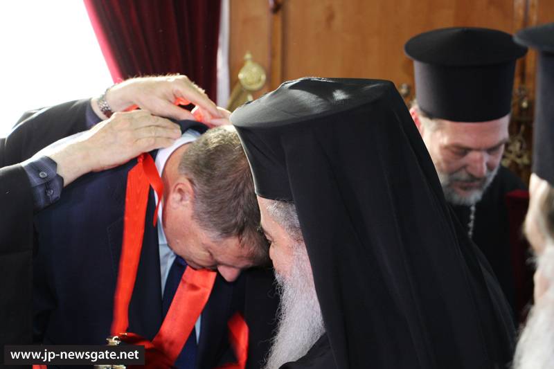 μα τῇ ἀφίξει εἰς τήν αἴθουσαν τοῦ Θρόνου, ὁ Μακαριώτατος προσεφώνησεν Αὐτόν διά τῆς κάτωθι προσφωνήσεως Αὐτοῦ ἀγγλιστί, ἅμα δέ τῇ λήξει τῶν λόγων Αὐτοῦ, ἀπένειμεν αὐτῷ τήν τιμητικήν διάκρισιν τοῦ Μεγάλου Σταυροφόρου τοῦ Τάγματος τῶν Ἱπποτῶν τοῦ Παναγίου Τάφου εἰς ἀναγνώρισιν τῆς συμπαραστάσεως αὐτοῦ πρός τό Ὀρθόδοξον Πατριαρχεῖον τῆς Ρουμανίας, πρός τήν Μητέρα τῶν Ἐκκλησιῶν καί ἀπένειμεν αὐτῷ ὡσαύτως εἰκόνα τῆς Θεοτόκου Ἱεροσολυμιτίσσης, τῇ ἐριτίμῳ δέ συζύγῳ αὐτοῦ κ. Κάρμεν ἀπένειμεν ἐπιστήθιον σταυρόν καί εἰς τά μέλη τῆς συνοδείας αὐτοῦ Ἱεροσολυμιτικάς εὐλογίας.