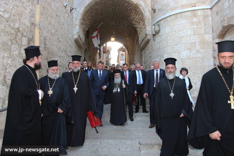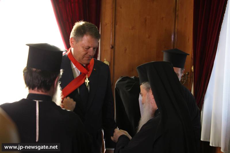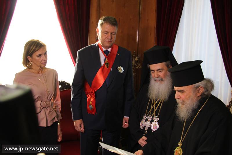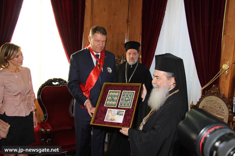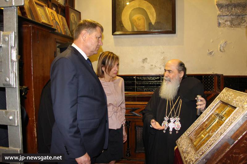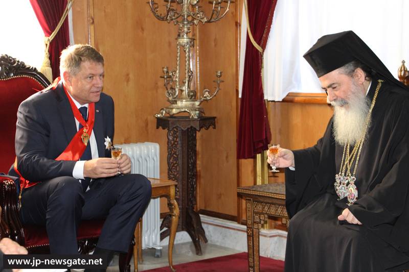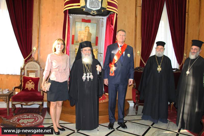 Τόν ἐξοχώτατον Πρόεδρον τῆς Ρουμανίας καί τήν συνοδείαν αὐτοῦ ὑπεδέχθη ἐνθέρμως ἡ Α.Θ.Μ. ὁ Πατήρ ἡμῶν καί Πατριάρχης Ἱεροσολύμων κ.κ. Θεόφιλος καί Ἁγιοταφῖται Πατέρες εἰς τήν αἴθουσαν τοῦ Πατριαρχείου, ἀφ’ οὗ παρέλαβον αὐτόν ἐκ τῆς Πύλης τοῦ Δαυΐδ ὁ Πατριαρχικός Ἐπίτροπος Σεβασμιώτατος Μητροπολίτης Καπιτωλιάδος κ. Ἡσύχιος καί ὁ Ἀρχιμανδρίτης Πορφύριος.