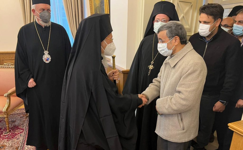 Ο κ. Πρόεδρος είχε εγκάρδια συνομιλία με την Α.Θ.Παναγιότητα τον Οικουμενικό Πατριάρχη κ. Βαρθολομαίο, ο οποίος μεταξύ άλλων αναφέρθηκε στις παλαιότερες επισκέψεις του σε ισλαμικές χώρες, μέσα στο πλαίσιο του διεξαγομένου διαθρησκειακού διαλόγου, ενώ στάθηκε ιδιαιτέρως στις θετικές εντυπώσεις του από την προ εικοσαετίας περίπου επίσημη επίσκεψή του στο Ιράν, κατόπιν προσκλήσεως του τότε Υπουργού Πολιτισμού της χώρας.