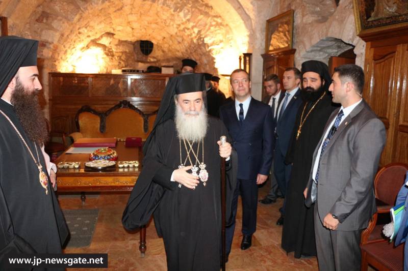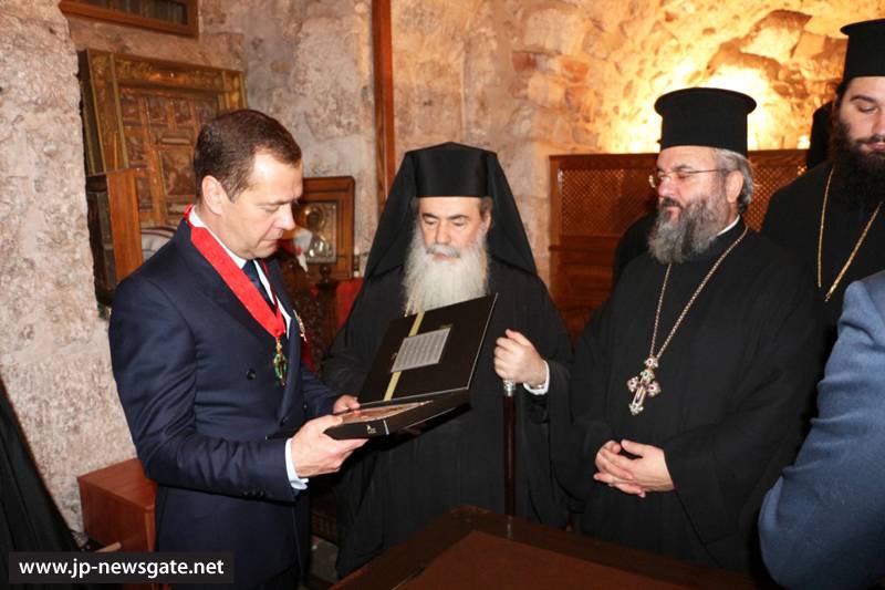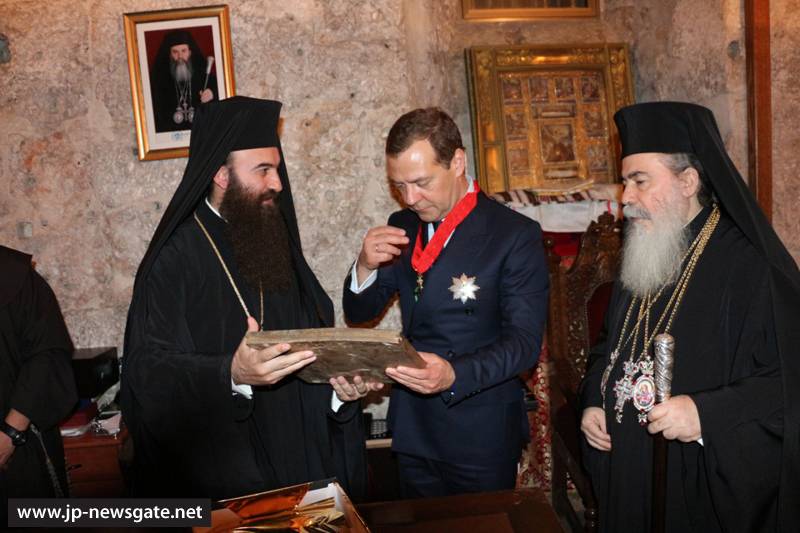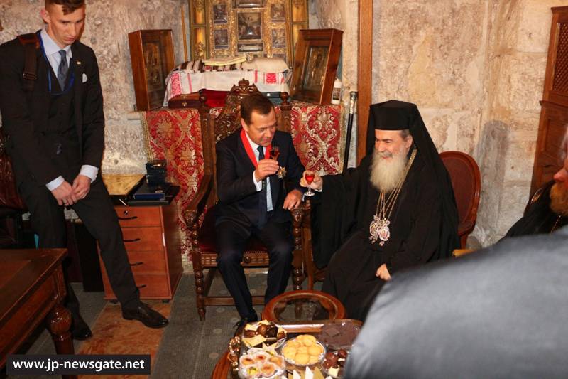 Εἰς τό Γραφεῖον τοῦ Ναοῦ τῆς Ἀναστάσεως τοῦ Γέροντος Σκευοφύλακος ὁ Μακαριώτατος ἐτίμησε τόν ἐξοχώτατον Πρωθυπουργόν τῆς Ρωσίας διά τῆς τιμητικῆς διακρίσεως τοῦ Ἀνωτέρου Ταξιάρχου τοῦ Τάγματος τῶν Ἱπποτῶν τοῦ Παναγίου Τάφου εἰς ἀναγνώρισιν τῆς Ὀρθοδόξου πίστεως αὐτοῦ καί τῆς βοηθείας αὐτοῦ καί συμπαραστάσεως πρός τά Πανάγια Προσκυνήματα καί τό Πατριαρχεῖον Ἱεροσολύμων.