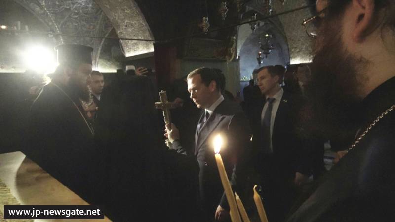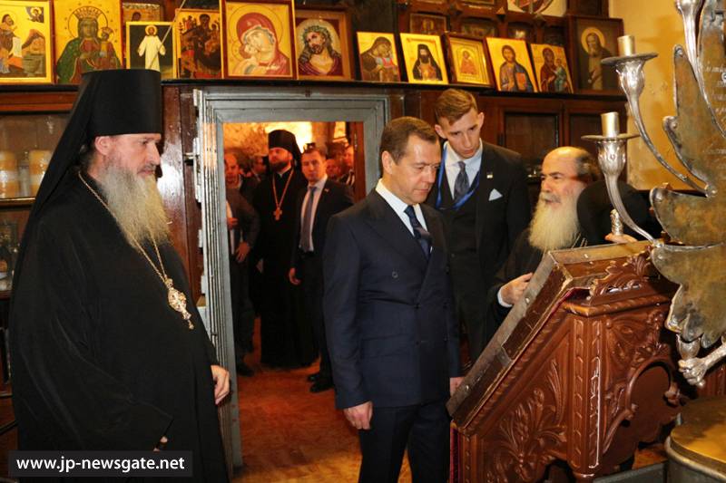 Ὁ ἐξοχώτατος Πρωθυπουργός τῆς Ρωσίας προσεκύνησεν εἰς τήν Ἁγίαν Ἀποκαθήλωσιν, τόν Πανάγιον Τάφον καί τόν Φρικτόν Γολγοθᾶν, ξεναγούμενος ὑπό τοῦ Μακαριωτάτου μέ ἰδιαιτέραν ἔμφασιν εἰς τάς ἐπιτελουμένας ἐργασίας ἀποκαταστάσεως τοῦ Ἱεροῦ Κουβουκλίου τοῦ Παναγίου Τάφου.