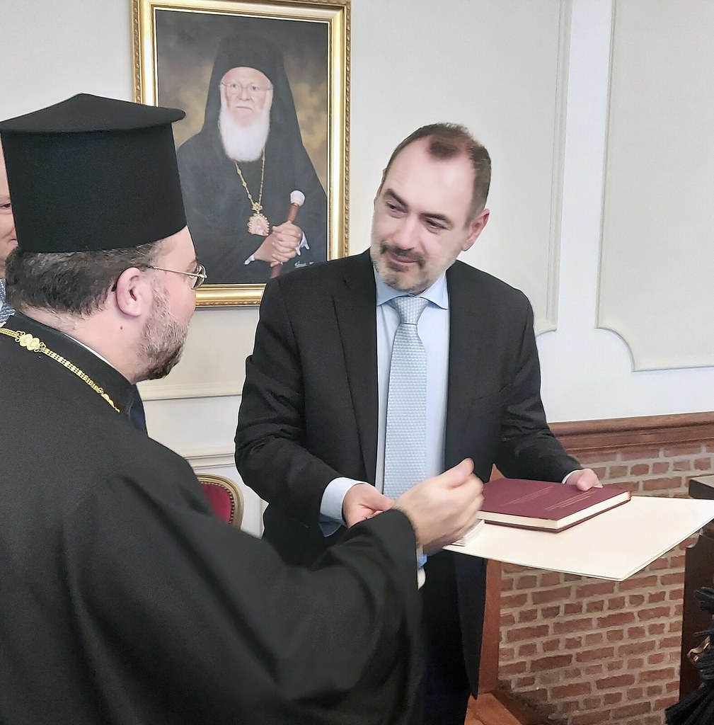 Τον κύριο Υφυπουργό υποδέχτηκαν εκ μέρους του απουσιάζοντος στο εξωτερικό Σεβασμιωτάτου Μητροπολίτου Βελγίου και Εξάρχου Κάτω Χωρών και Λουξεμβούργου κ. Αθηναγόρου, ο Θεοφιλέστατος Επίσκοπος Απολλωνιάδος κ. Ιωακείμ, Βοηθός του Επίσκοπος, και οι εργαζόμενοι στην Κεντρική διοίκηση της Μητροπόλεως, ενώ την συνοδεία του αποτελούσαν ο Πρέσβυς της Ελλάδος στο Βέλγιο κ. Διονύσιος Καλαμβρέζος, ο Α’ Σύμβουλος της Πρεσβείας και επικεφαλής του Προξενικού Γραφείου κ. Βασίλειος Ζαρμπάλης και στενοί του συνεργάτες.