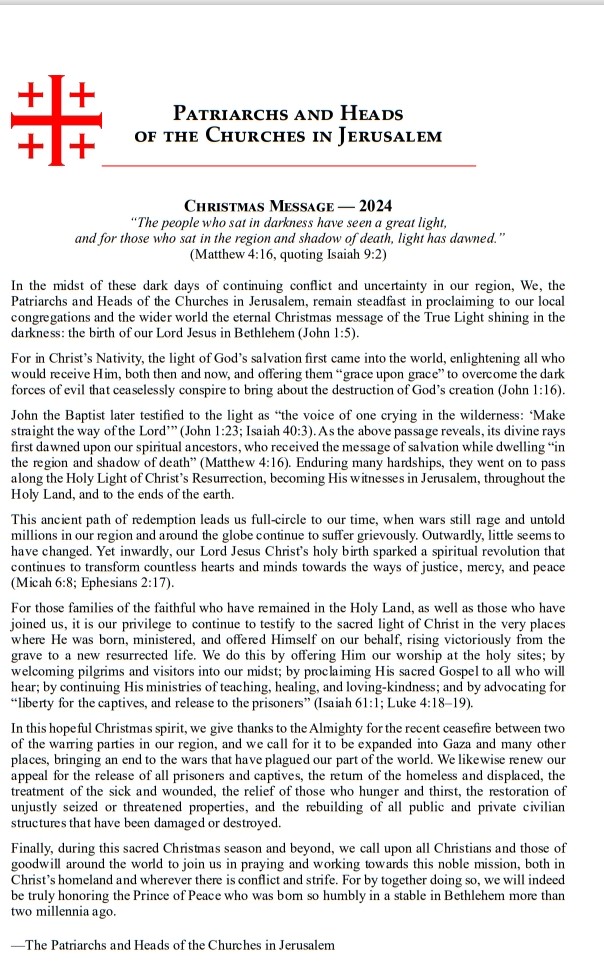 Τήν Τετάρτην, 28ην Νοεμβρίου / 11ην Δεκεμβρίου 2024, ἔλαβε χώραν εἰς τό Πατριαρχεῖον συνάντησις τῶν Ἀρχηγῶν τῶν Χριστιανικῶν Ἐκκλησιῶν τῶν Ἱεροσολύμων ὑπό τήν ἡγεσίαν τῆς Α.Θ.Μ. τοῦ Πατρός ἡμῶν καί Πατριάρχου Ἱεροσολύμων κ.κ. Θεοφίλου Γ’.  Εἰς τήν συνάντησιν ταύτην συνεζητήθη καί ἐπεκυρώθη τό κοινόν Μήνυμα τῶν Χριστουγέννων, τό ὁποῖον άγγλιστί ἔχει ὡς ἕπεται: Heads of Churches in […]