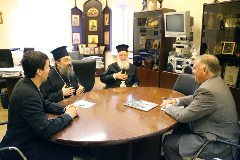 Οι δυο Έλληνες Ιεράρχες που συνοδεύουν στην Ρωσία τον Σταυρό του Αποστόλου Ανδρέα από την Πάτρα είχαν την ευκαιρία να συζητήσουν για την πορεία του προσκυνήματος, το οποίο πραγματοποιείται με ευθύνη του ιδρύματος.