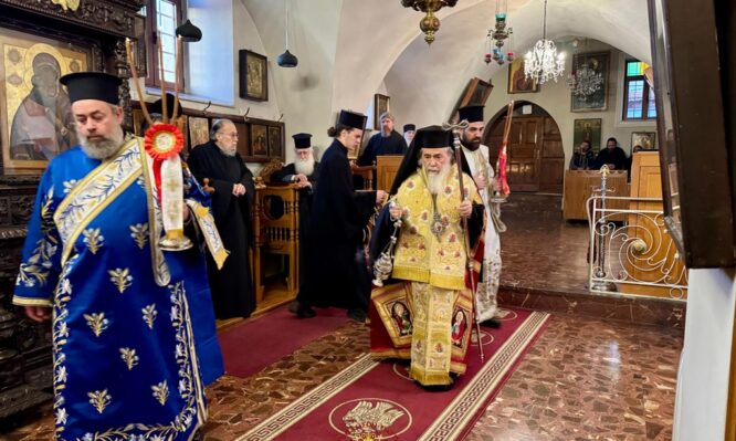 Τήν πρωΐαν τῆς Παρασκευῆς, 4ης/17ης Ἰανουαρίου 2025, εἰς τόν μοναστηριακόν Ἱερόν Ναόν τῶν Ἁγίων Κωνσταντίνου καί Ἑλένης, τῇ χοροστασίᾳ τοῦ Μακαριωτάτου Πατριάρχου Ἱεροσολύμων κ.κ. Θεοφίλου Γ’ συμφώνως πρός τό Τυπικόν τῆς Ἐκκλησίας μετά τήν Ἀκολουθίαν τοῦ Ὄρθρου ἀνεγνώσθησαν αἱ Μεγάλαι Ὧραι τῶν Θεοφανείων. Τῆς πρώτης τούτων ἀνέγνωσεν τό Εὐαγγέλιον καί ἐτέλεσε τό Θυμίαμα ὁ Μακαριώτατος […]