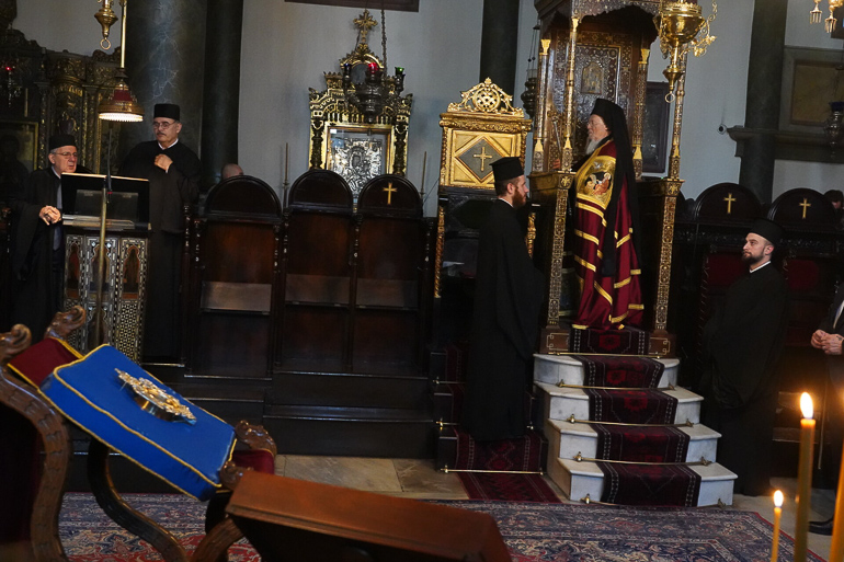 Την παραμονή της Πρωτοχρονιάς ο Οικουμενικός Πατριάρχης χοροστάτησε μαζί με τους Σεβ. Μητροπολίτες Γέροντα Χαλκηδόνος κ. Εμμανουήλ, Γέροντα Δέρκων κ. Απόστολο, Γέροντα Πριγκηποννήσων κ. Δημήτριο, Φιλαδελφείας κ. Μελίτωνα, Μύρων κ. Χρυσόστομο, Ικονίου κ. Θεόληπτο, Καλλιουπόλεως και Μαδύτου κ. Στέφανο, Κυδωνιών κ. Αθηναγόρα, Πισιδίας κ. Ιώβ, Σηλυβρίας κ. Μάξιμο, Σαράντα Εκκλησιών κ. Ανδρέα και Προύσης κ. Ιωακείμ, στον Μ. Εσπερινό που τελέστηκε στον Πατριαρχικό Ναό, στον οποίο παρέστησαν συμπροσευχόμενοι οι Θεοφιλ. Επίσκοποι Αλικαρνασσού κ. Αδριανός, Αραβισσού κ. Κασσιανός, Ευδοκιάδος κ. Αμβρόσιος, Τράλλεων κ. Βενιαμίν, Δαφνουσίας κ. Σμάραγδος και Ξανθουπόλεως κ. Παΐσιος, καθώς και οι Πρόξενοι της Ελλάδος και της Ουκρανίας στην Πόλη Ευγεν. κ. Δανάη Βασιλάκη και Εντιμ. κ. Maksim Vdovychenko, και πλήθος πιστών.