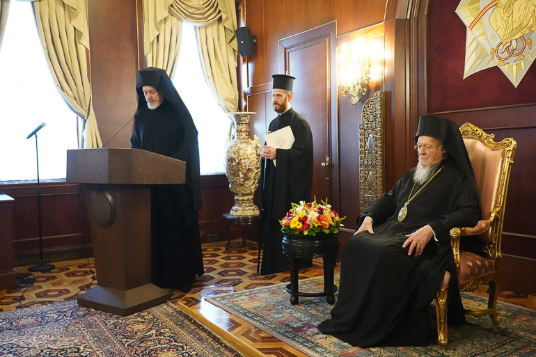 Προηγουμένως τον Παναγιώτατο προσφώνησαν ο Σεβ. Μητροπολίτης Γέρων Χαλκηδόνος κ. Εμμανουήλ, ως εκπρόσωπος της Ιεραρχίας του Θρόνου, και ο Εντιμολ. Άρχων Ιερομνήμων κ. Αντώνιος Χατζόπουλος, ο οποίος ευχήθηκε εκ μέρους των Οφφικιαλίων της Μ.τ.Χ.Ε. και της Ομογενείας της Πόλεως.