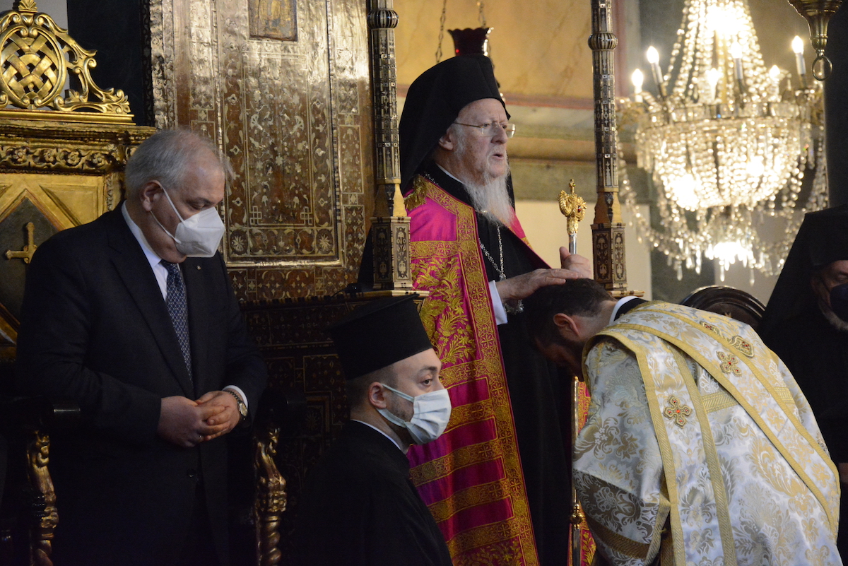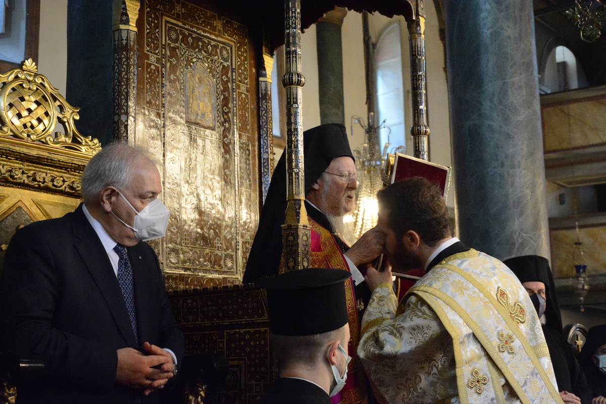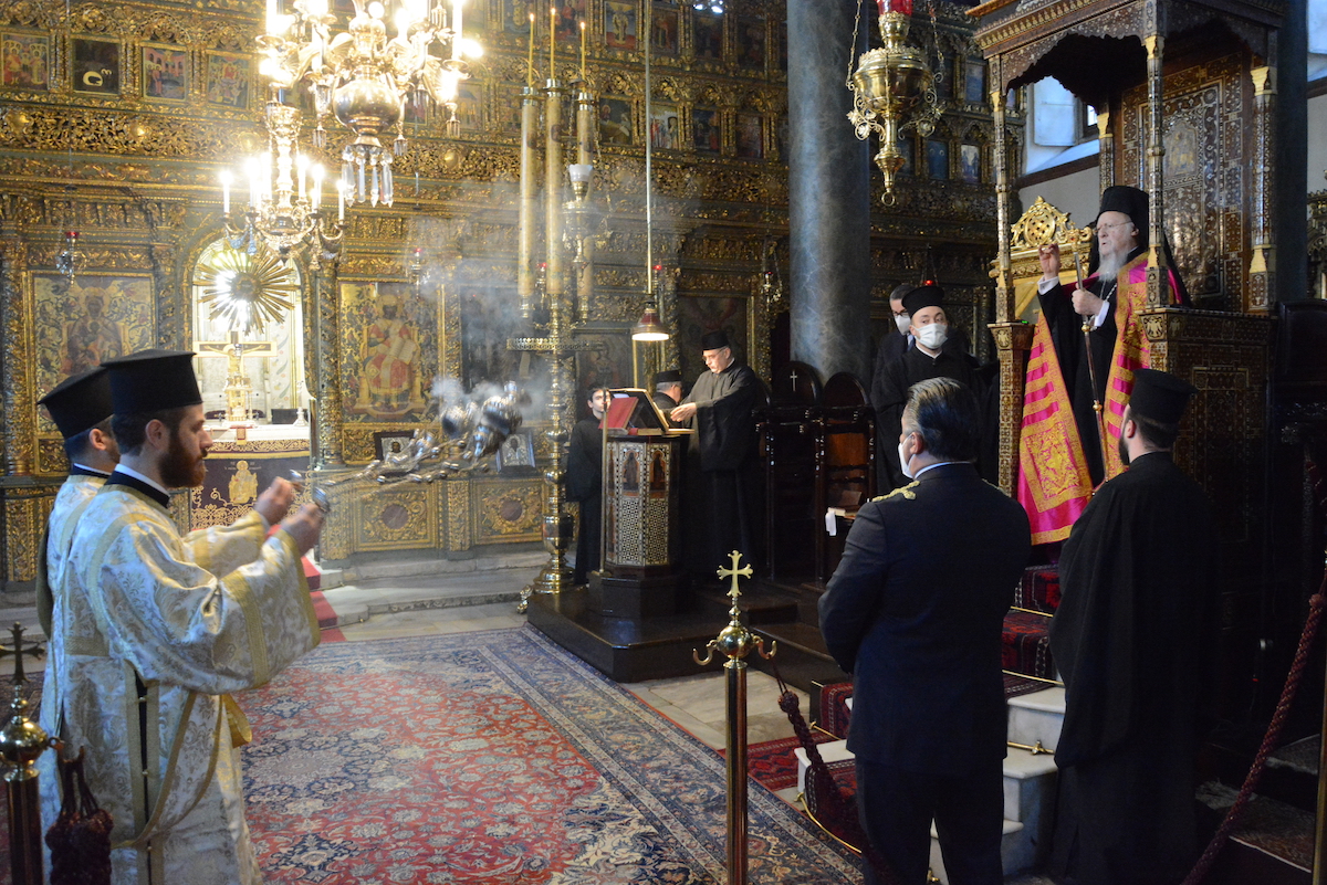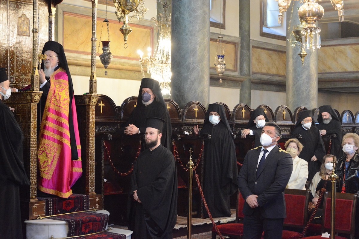 Νωρίτερα, ο Οικουμενικός Πατριάρχης, χοροστάτησε στην Θεία Λειτουργία που τελέστηκε στον Πατριαρχικό Ναό του Αγίου Γεωργίου, συγχοροστατούντων των Σεβ. Αρχιερέων Γέροντος Χαλκηδόνος κ. Εμμανουήλ, Γέροντος Δέρκων κ. Αποστόλου, Μυριοφύτου και Περιστάσεως κ. Ειρηναίου, Μύρων κ. Χρυσοστόμου και Αυστραλίας κ. Μακαρίου.