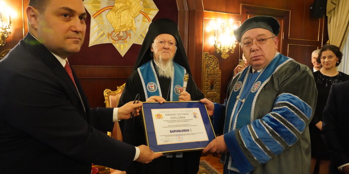 Ο Οικουμενικός Πατριάρχης κ. Βαρθολομαίος αναγορεύτηκε Επίτιμος Διδάκτορας του Κρατικού Πανεπιστημίου του Σοχούμι της Γεωργίας, σε ειδική τελετή που πραγματοποιήθηκε την Τετάρτη, 23 Νοεμβρίου 2022, το πρωί, στην Αίθουσα του Θρόνου, στον Πατριαρχικό Οίκο στο Φανάρι.