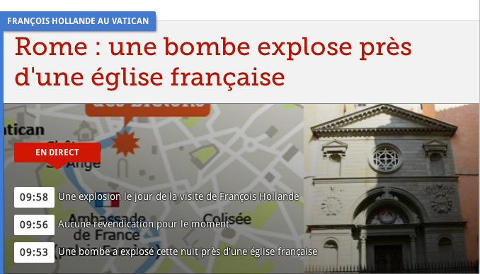 Την πρώτη του επίσκεψη στο Βατικανό από την ημέρα της εκλογής του στην προεδρία της Γαλλίας πραγματοποιεί ο Φρανσουά Ολάντ. Η επίσκεψή του στο Αγία Έδρα συνοδεύτηκε με βόμβα κοντά σε γαλλική εκκλησία.