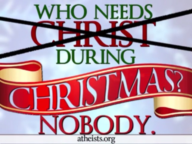 Με μια ψηφιακή διαφημιστική πινακίδα και χρησιμοποιώντας κινούμενα γραφικά οι άθεοι στην Αμερική προσπαθούν να μεταδώσουν το δικό τους αρνητικό μήνυμα για την εορτή των Χριστουγέννων. Το μήνυμα αναφέρει ότι «κανείς» δεν χρειάζεται τον «Χριστό» στην διάρκεια των Χριστουγέννων.