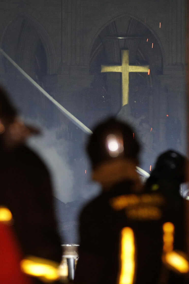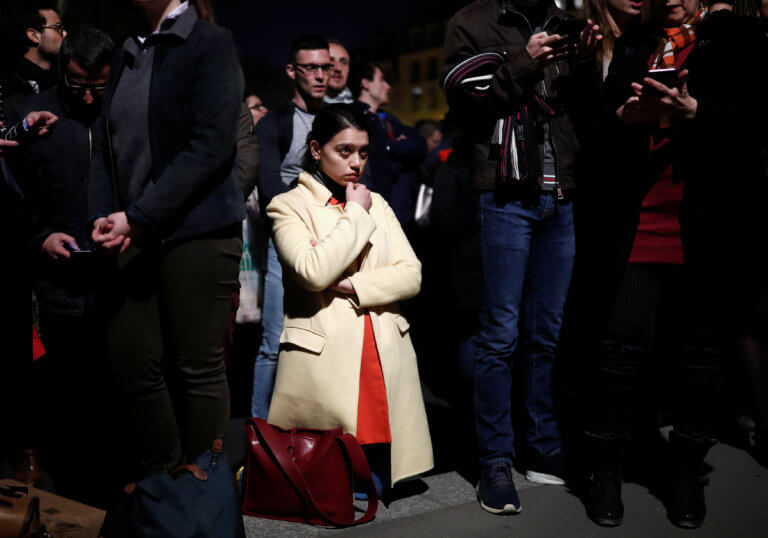 Αποσβολωμένοι, Παριζιάνοι, τουρίστες (καθολικοί, άθεοι, μουσουλμάνοι) αδυνατούσαν να πάρουν τα μάτια τους από το θέαμα της πύρινης κόλασης στην Παναγία των Παρισίων, στο Ιλ ντε λα Σιτέ, στο κέντρο της γαλλικής πρωτεύουσας. Κάποιοι έψαλλαν το Χαίρε Μαρία, άλλοι προσεύχοντανγονατιστοί. Έβρεχε στάχτη.
