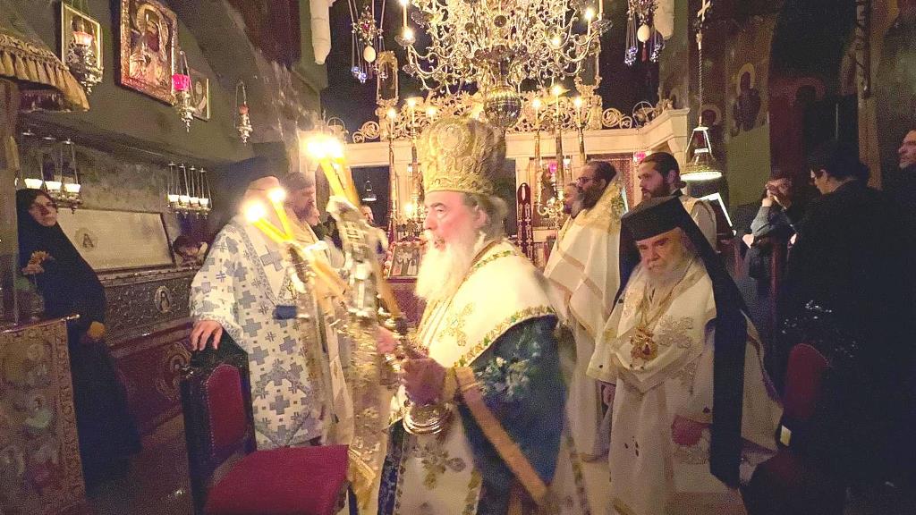 Ἐσυνεχίσθη δέ δι’ ὁλονυκτίου ἀγρυπνίας, προεξάρχοντος τοῦ Μακαριωτάτου Πατρός ἡμῶν καί Πατριάρχου Ἱεροσολύμων κ.κ. Θεοφίλου καί συλλειτουργούντων Αὐτῷ τῶν Σεβασμιωτάτων Ἀρχιεπισκόπων Κωνσταντίνης κ. Ἀριστάρχου καί Μαδάβων κ. Ἀριστοβούλου, τοῦἹερομονάχου τῆς Μονῆς π. Χρυσογόνου, τοῦ Ἱερέως π. Ἀθανασίου, Ρωσοφώνων Ἱερομονάχων καί Πρεσβυτέρων, τοῦ Ἀρχιδιακόνου π. Μάρκου, καί τῶν Ἱεροδιακόνων π. Συμεών καί π. Δοσιθέου, ψαλλούσης χορῳδίας ἱεροψαλτῶν ἀφιχθέντων ἐπί τούτου ἐξ Ἑλλάδος ἤτοι τῶν κ. Σταύρου Χρήστου, κ. Σταύρου Ἰωάννου, κ. Θεοτοκάτου Νικολάου, κ. Σταύρου Πέτρου, κ. Κάμτσιου Ἠλιοῦ καί κ. Κάμτσιου Παναγιώτου.