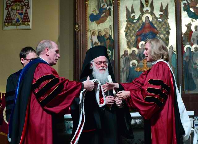 Ο Αρχιεπίσκοπος Αμερικής κ. Δημήτριος καλωσόρισε με ιδιαίτερη συγκίνηση τον αδελφό και φίλο Ιεράρχη στο πανεπιστημιακό ίδρυμα από το οποίο και ο ίδιος έλαβε τιμητικό διδακτορικό δίπλωμα το 2007 και στο οποίο ιδρύθηκε Έδρα Ορθοδόξου Θεολογίας και Πολιτισμού με την επωνυμία Έδρα Αρχιεπισκόπου Δημητρίου.