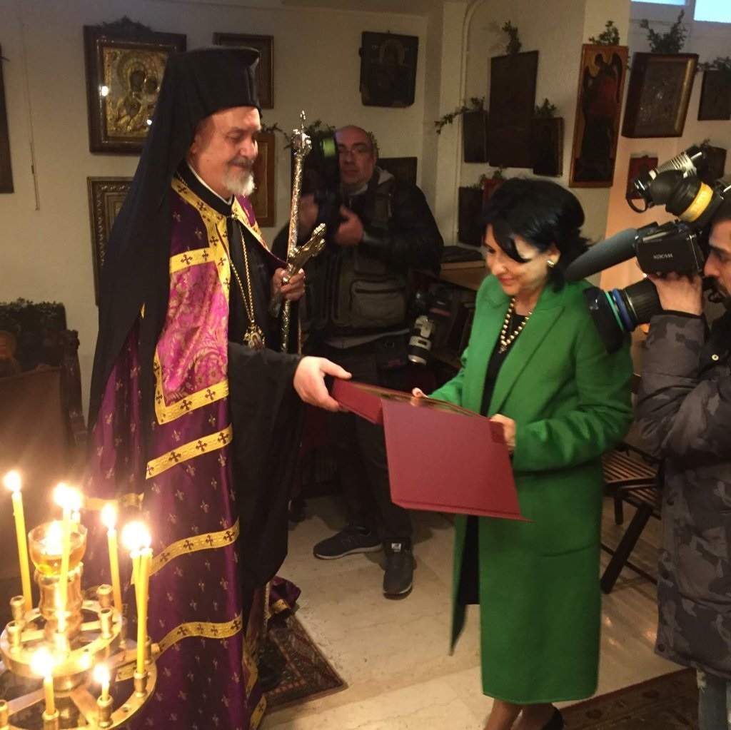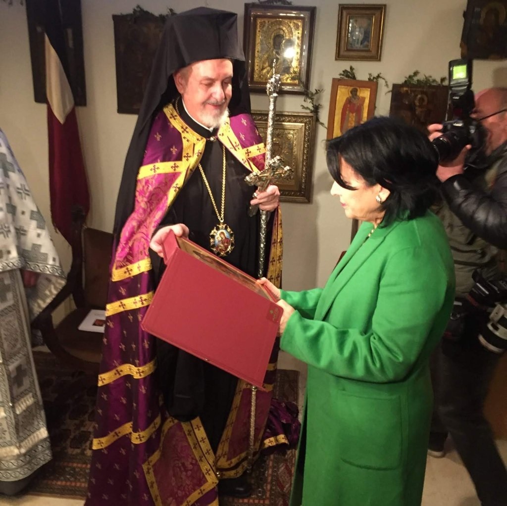 Ο Σεβασμιώτατος Γαλλίας καλωσόρισε την κ. Πρόεδρο στην ενορία της Αγίας Νίνας η οποία υπάγεται στο Οικουμενικό Πατριαρχείο και στην Ιερά Μητρόπολη Γαλλίας εδώ και 90 χρόνια. Υπογράμμισε ότι ο πατέρας της κ. Προέδρου είναι ένας εκ των ιδρυτών της ενορίας και εξέφρασε την υπερηφάνεια της κοινότητας και της Ιεράς Μητροπόλεως, που η κ. Zurabishvili ανήλθε στον υψηλότατο βαθμό της Προέδρου της Γεωργίας.