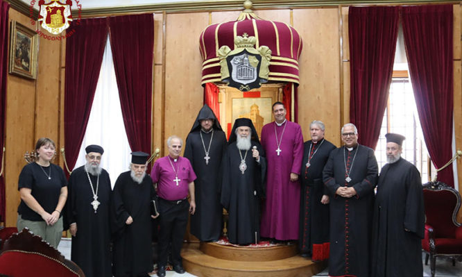 Τήν Δευτέραν, 13ην/26ην Αὐγούστου 2024, ὁ Μακαριώτατος Πατήρ ἡμῶν καί Πατριάρχης Ἱεροσολύμων κ.κ. Θεόφιλος συνηντήθη μετά τῶν Ἀρχηγῶν τῶν Ἐκκλησιῶν εἰς Ἱερουσαλήμ, μετά τῶν ὁποίων συνεζήτησε διά τήν λίαν κρίσιμον κατάστασιν πολεμικῶν συγκρούσεων εἰς τήν περιοχήν τῆς Ἁγίας Γῆς. Οἱ Ἀρχηγοί τῶν Ἐκκλησιῶν τῆς Ἱερουσαλήμ ἐξέδοσαν τό κάτωθι ἐπίσημον Ἀνακοίνωθέν: