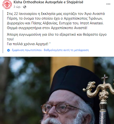 Άπαντες κληρικοί και λαϊκοί της Ιεράς Αρχιεπισκοπής Αλβανίας εκφράζουν δημόσια μέσω διαδικτύου στον Μακαριώτατο κ. Αναστάσιο τις θερμές ευχές και την άπειρη ευγνωμοσύνη τους για το εξαιρετικό και θεάρεστο έργο που τους έχει προσφέρει όλα αυτά τα χρόνια.