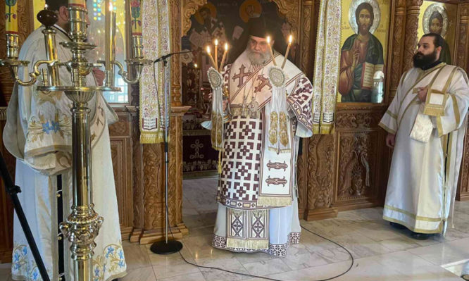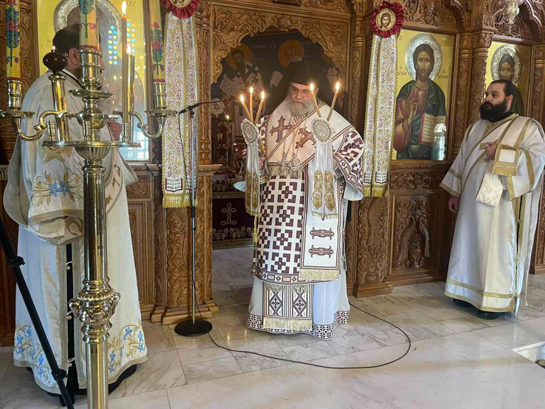 Τον Πανιερώτατο πλαισίωναν ο Πρωτοπρεσβύτερος Παρασκευάς Αγάθωνος, ο Αρχιδιάκονος Ραφαήλ Μισιαούλης και ο Ιεροδιάκονος Αρσένιος Αθανασίου. Στο Ιερό Βήμα παρέστη συμπροσευχόμενος ο πολιός ιερέας της κοινότητος, Οικονόμος Ανδρέας Συμεού.