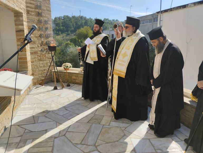 Μετά τη Θεία Λειτουργία, ο Πανιερώτατος τέλεσε τρισάγιο στην προτομή των ηρώων και ακολούθησε κατάθεση στεφάνων.