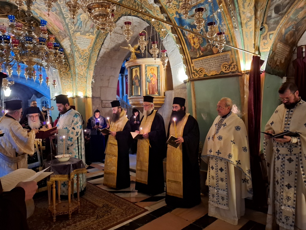 Τό Σάββατον, 16ην Φεβρουαρίου / 1ην Μαρτίου 2025, ἐτελέσθη θεία Λειτουργία ἐπί τοῦ Φρικτοῦ Γολγοθᾶ, προεξάρχοντος τοῦ Σεβασμιωτάτου Ἀρχιεπισκόπου Λύδδης κ. Δημητρίου, συλλειτουργούντων αὐτῷ τῶν Ἀρχιμανδριτῶν Κλαυδίου, Διονυσίου, Φιλουμένου, Ἀμφιλοχίου, τοῦ π. Θαδδαίου καί τοῦ τοῦ Ἀρχιδιακόνου π. Μάρκου, ψάλλοντος τοῦ Ἱεροδιακόνου π. Δοσιθέου καί προσευχομένων μοναχῶν, μοναζουσῶν καί μελῶν τῆς Ἐκκλησίας Ἱεροσολύμων.