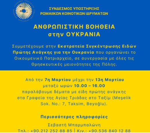 Στην εκστρατεία αυτή για την ανθρωπιστική βοήθεια στην Ουκρανία, συμμετέχει και ο Σύνδεσμος Υποστήριξης Ρωμαίικων Κοινοτικών Ιδρυμάτων.
