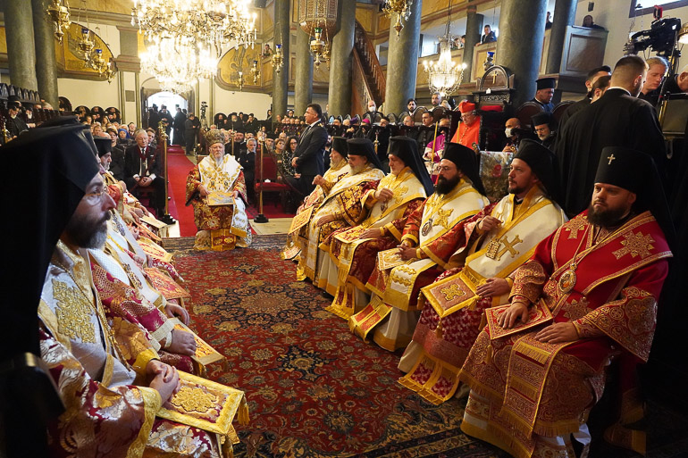 Συμπροσευχήθηκαν οι Σεβ. Μητροπολίτες Γέρων Χαλκηδόνος κ. Εμμανουήλ, Γέρων Πριγκηποννήσων κ. Δημήτριος, Αρχιεπίσκοπος Ανθηδώνος κ. Νεκτάριος, Επίτροπος του Παναγίου Τάφου στην Πόλη, ο Πανοσιολ. Αρχιμανδρίτης κ. Γεώργιος Χριστοδούλου, Αρχιγραμματεύς της Ιεράς Συνόδου της Εκκλησίας της Κύπρου, εκ προσώπου του Τοποτηρητού του Αρχιεπισκοπικού Θρόνου, Πανιερ. Μητροπολίτου Πάφου κ. Γεωργίου. Επίσης, οι Σεβ. Ιεράρχες Βρυούλων κ. Παντελεήμων, Δωδώνης κ. Χρυσόστομος, Φιλαδελφείας κ. Μελίτων, Μυριοφύτου και Περιστάσεως κ. Ειρηναίος, Μύρων κ. Χρυσόστομος, Θυατείρων και Μεγάλης Βρεταννίας κ. Νικήτας, Ικονίου κ. Θεόληπτος, Σάρδεων κ. Ευάγγελος, Γουίνιπεγκ κ. Ιλαρίων, Κρήτης κ. Ευγένιος, Κυδωνιών κ. Αθηναγόρας, Πισιδίας κ. Ιώβ, Σηλυβρίας κ. Μάξιμος, Ίμβρου και Τενέδου κ. Κύριλλος, Ρεθύμνης και Αυλοποτάμου κ. Πρόδρομος, Προύσης κ. Ιωάκείμ, και Γαλλίας κ. Δημήτριος, οι Θεοφιλ. Επίσκοποι Ρηγίου κ. Ειρηναίος, Αλικαρνασσού κ. Αδριανός, Αραβισσού κ. Κασσιανός, Τράλλεων κ. Βενιαμίν, Δορυλαίου κ. Δαμασκηνός, Δαφνουσίας κ. Σμάραγδος, Ξανθουπόλεως κ. Παΐσιος και Κνωσού κ. Μεθόδιος, ο Εξοχ. Πρέσβης της Ελλάδος στην Άγκυρα κ. Χριστόδουλος Λάζαρης, Κληρικοί, Μοναχοί και Μοναχές, εκπρόσωποι χριστιανικών κοινοτήτων της Πόλεως, Άρχοντες Οφφικιάλιοι της Μεγάλης του Χριστού Εκκλησίας υπό τον Γενικό Γραμματέα της Αδελφότητός τους “Παναγία η Παμμακάριστος”, Εντιμολ. κ. Κωνσταντίνο Δεληκωσταντή, Άρχοντα Διδάσκαλο του Γένους, οι Γενικοί Πρόξενοι της Ελλάδος και της Ουκρανίας στην Πόλη, Ευγεν. κ. Γεωργία Σουλτανοπούλου, και Εντιμ. κ. Roman Nedilskyi, καθηγητές και μαθητές Ομογενειακών Σχολείων της Πόλης, και πλήθος πιστών από την Πόλη, και το εξωτερικό.