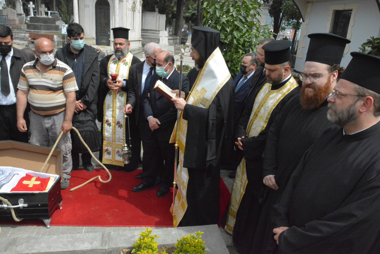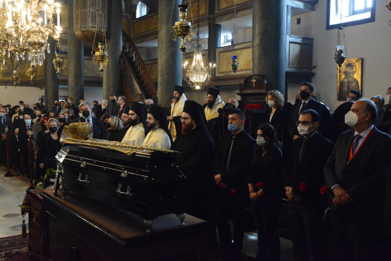 Ακολούθως, στις 11 π.μ., τελέστηκε η νεκρώσιμος ακολουθία, προεξάρχοντος του Παναγιωτάτου, συμπαραστατουμένου από τους Σεβ. Μητροπολίτες Γέροντα Πριγκηποννήσων κ. Δημήτριο, Σεβαστείας κ. Σεραφείμ, Μυριοφύτου και Περιστάσεως κ. Ειρηναίο, Μύρων κ. Χρυσόστομο, Ειρηνουπόλεως κ. Νίκανδρο, Ιταλίας κ. Πολύκαρπο, Κρήνης κ. Κύριλλο, Καλλιουπόλεως και Μαδύτου κ. Στέφανο, Πέτρας και Χερρονήσου κ.Γεράσιμο και Σαράντα Εκκλησιών κ.Ανδρέα.