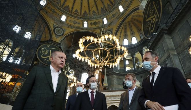 Στην Τουρκία ο Ρετζέπ Ταγίπ Ερντογάν άρχισε πάλι της προκλήσεις και σε ένα εθνικιστικό και ανθελληνικό κρεσέντο είπε ότι η κυβέρνησή του έκανε «κομμάτια τα δεσμά» με την μετατροπή της Αγίας Σοφίας σε τζαμί και επισήμανε ότι το ιστορικό μνημείο της Ορθοδοξίας και της ανθρωπότητας είναι «κληρονομιά από την άλωση» της Κωνσταντινούπολης.