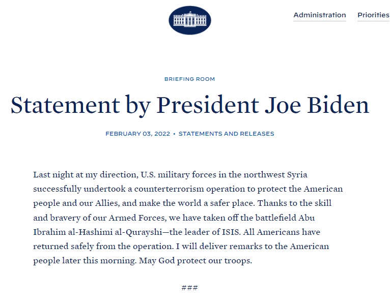 «Χθες το βράδυ υπό την καθοδήγησή μου, οι στρατιωτικές δυνάμεις των ΗΠΑ στη βορειοδυτική Συρία ανέλαβαν με επιτυχία μια αντιτρομοκρατική επιχείρηση για να προστατεύσουν τον αμερικανικό λαό και τους Συμμάχους μας και να κάνουν τον κόσμο πιο ασφαλή», αναφέρει ο Μπάιντεν σε ανακοίνωση του Λευκού Οίκου.
