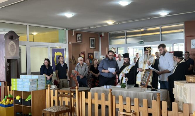 Στη συνέχεια ο Σεβασμιώτατος μοίρασε στα παιδιά τα βαλιτσάκια «Χαρούμενα Πρωτάκια», με προϊόντα υγιεινής και όχι μόνο, ευγενική χορηγία της εταιρείας Care Direct.