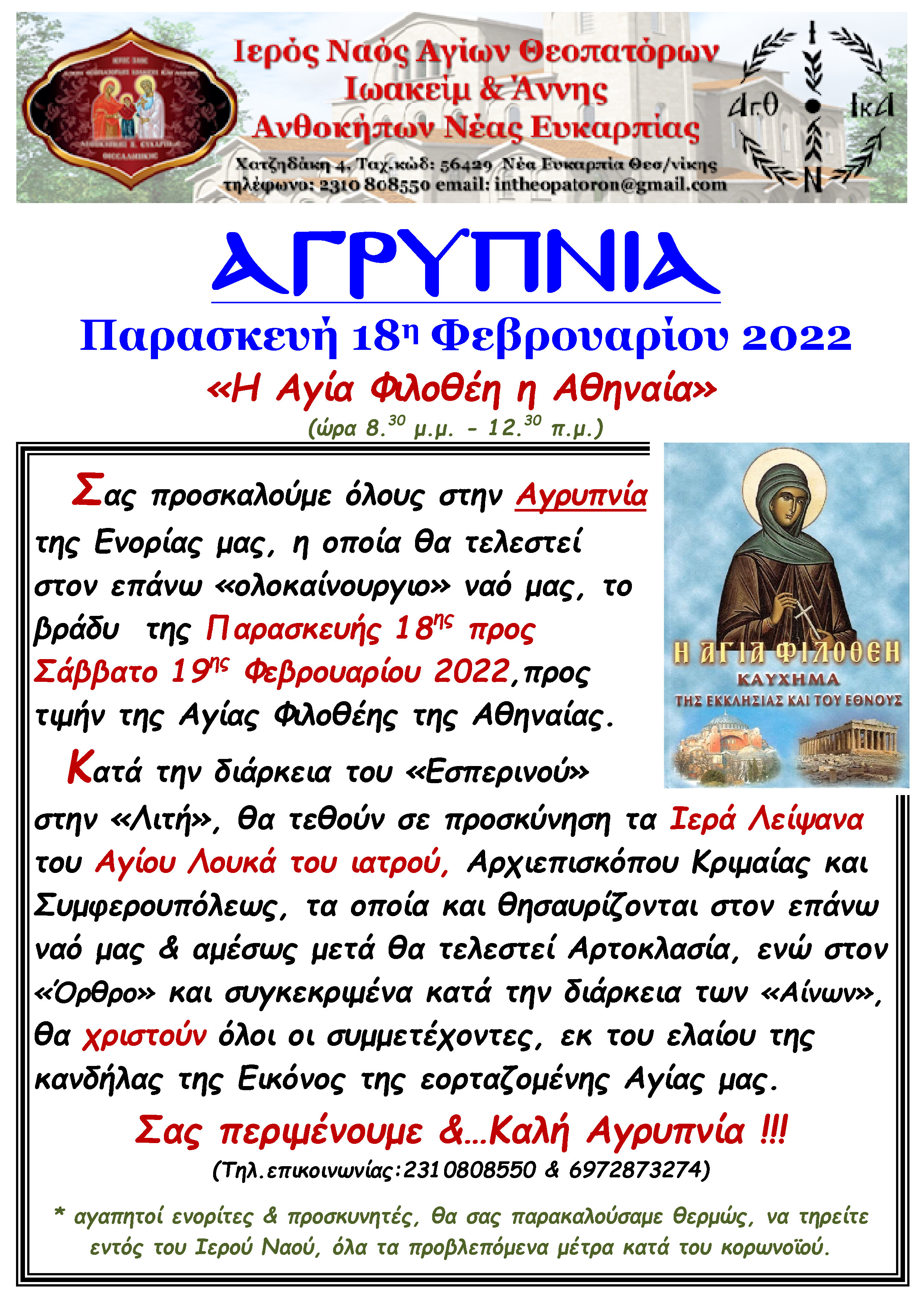 Στον Ι. Ναό Αγίων Θεοπατόρων Ιωακείμ και Άννης, της Μητρόπολης Νεαπόλεως και Σταυρουπόλεως, θα τελεστεί Αγρυπνία, την Παρασκευή, 18 Φεβρουαρίου 2022, από τις 20:30 μ.μ. έως 12:30 π.μ. προς τιμήν της Αγίας Φιλοθέης της Αθηναίας.