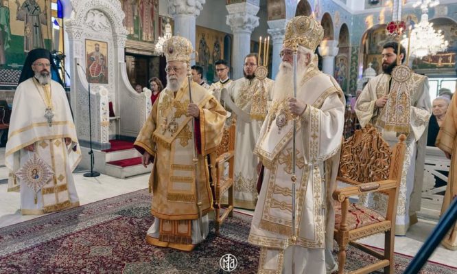 Κατά την διάρκεια της Θείας Λειτουργίας τελέστηκε Μνημόσυνο για τους πεσόντες κατά την τουρκική εισβολή, επί τη επετείω των 50 χρόνων και για τον Άγνωστο Ναυτικό, όπως συμβαίνει κάθε χρόνο στην έναρξη της Ναυτικής Εβδομάδας. Ακολούθως, τον Κύπριο Ιεράρχη προσφώνησε ο Σεβ. Ποιμενάρχης μας κ. Ιγνάτιος, ο οποίος, μεταξύ άλλων, σημείωσε ότι «η μαρτυρική Αμμόχωστος, η οποία, «κρίμασι οίς οίδε Κύριος», παραμένει εδώ και πενήντα ολόκληρα χρόνια υπό τουρκική κατοχή, είναι το αντιπροσωπευτικότερο δείγμα της άδικης, παράνομης και απαράδεκτης διχοτόμησης της Κύπρου, της μεγάλης καταστροφής και του ξεριζωμού των κατοίκων της. Αισθανόμαστε ιερή συγκίνηση καθώς στο πρόσωπό σας ατενίζουμε την σπουδαία χριστιανική παράδοση του τόπου σας, που ξεκινά με τόν προκάτοχό σας, Άγιο Επιφάνιο, αρχιεπίσκοπο Κωνσταντίας της Κύπρου, τον Θαυματουργό, μεγάλο Πατέρα και Διδάσκαλο της Εκκλησίας μας. Ατενίζουμε, επίσης, την απαράμιλλη ομορφιά του τόπου σας και κυρίως το ψυχικό μεγαλείο των κατοίκων του. Ατενίζουμε, ωστόσο, με μεγάλη συγκίνηση, και την χαίνουσα πληγή του πόνου, της προσφυγιάς, του προβλήματος της κατοχής της βόρειας Κύπρου».