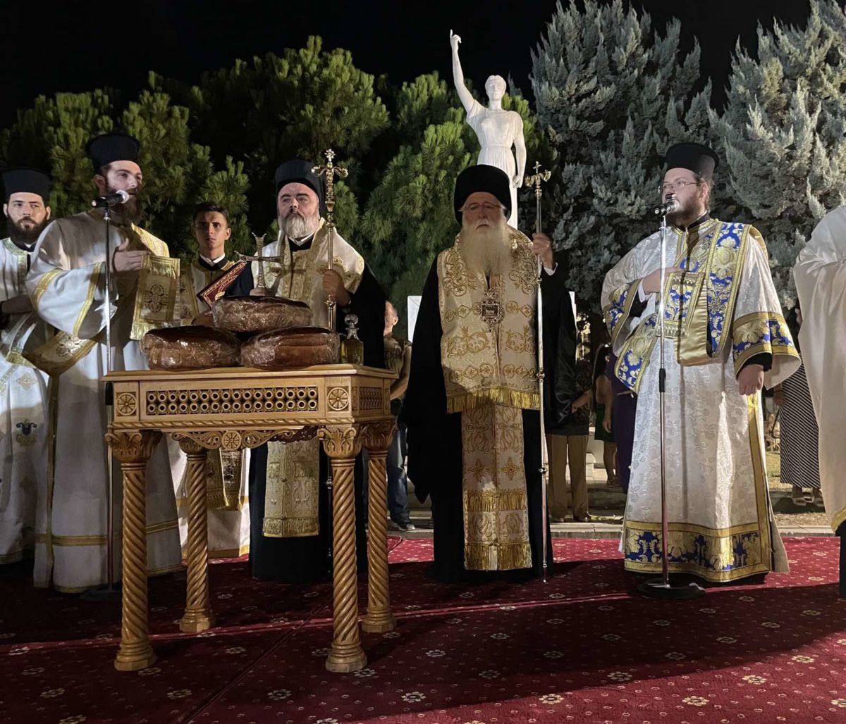 Κατά την διάρκεια του Εσπερινού εψάλησαν τα Εγκώμια επί του Επιταφίου της Παναγίας, κατά το Ιεροσολυμίτικο τυπικό, ενώ η αρτοκλασία τελέστηκε επί εξέδρας στο προαύλιο του Ναού. Τον Θείο Λόγο κήρυξε ο Σεβ. Ποιμενάρχης μας κ. Ιγνάτιος, ο οποίος τόνισε ότι «η Κοίμηση και η μετάσταση της Παναγίας μας δεν είναι το τέλος, αλλά μια καινούργια αρχή, που σηματοδοτεί και την δική μας πορεία. Γι’ αυτό και ο Ορθόδοξος λαός μας γιορτάζει τούτην την ημέρα με χαρά, με ενότητα, γιατί ξέρουμε ότι δεν είμαστε λαός ορφανός, αλλά έχουμε δίπλα μας την μεγάλη μας Μάνα, την Παναγιά μας. Η Κυρία Θεοτόκος μας διδάσκει να εμπιστευόμαστε το θέλημα του Θεού, με απόλυτη ελευθερία. Είναι μεγάλο μάθημα η εμπιστοσύνη και καταστροφική η καχυποψία μεταξύ των ανθρώπων. Μας διδάσκει τί σημαίνει χαρά. Όποιος εμπιστεύεται τον Θεό, ζει την χαρά, παρά τις στιγμές του πόνου, αυτόν που έζησε και Εκείνη. Μας διδάσκει την συγχώρηση, όπως ο Υιός Της συγχώρησε τους σταυρωτές του και μας θυμίζει ότι δεν υπάρχει αμαρτία που να μη συγχωρείται, όταν ενεργοποιηθεί η μετάνοια. Μας διδάσκει την ενότητα, καθώς η Ίδια μας ένωσε σε δύσκολες στιγμές και αγώνες και μας ενώνει και σήμερα. Απόψε, προσευχόμαστε στην μεγάλη Μητέρα μας να φύγει ο πόνος των παιδιών του πολέμου, των πυρόπληκτων συνανθρώπων μας, των ασθενούντων αδελφών μας…».