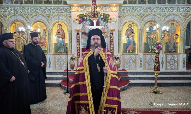 Πριν την απόλυση της Ακολουθίας ο Σεβασμιώτατος απένειμε το οφφίκιο του Οικονόμου στον π. Νικόλαο Μακρυπούλια, τον οποίο επήνεσε και συνεχάρη για την ανακαίνιση του Πνευματικού Κέντρου που θα εξυπηρετήσει τις ποιμαντικές δράσεις της Ενορίας. «Είναι απαραίτητο, αγαπητοί μου αδερφοί, κάθε Ενορία, εκτός από τον Ιερό Ναό, τα Παρεκκλήσια και τα Εξωκκλήσια της να διαθέτει και έναν χώρο μέσα στον οποίο θα βιώνουν οι πιστοί όλων των ηλικιών «την λειτουργία μετά την λειτουργία», όπως είναι οι κοινωνικές, φιλανθρωπικές και ιεραποστολικές δράσεις της Εκκλησίας. Δεν πρέπει να περιοριζόμαστε μόνο στην λατρευτική ζωή, αλλά οφείλει η λατρευτική ζωή να είναι το εφαλτήριο που θα μας οδηγεί να συμμετάσχουμε σε κοινές και ποικίλες δράσεις μέσα από τις οποίες θα κατηχούμαστε, θα αισθανόμαστε, ότι είμαστε μία πνευματική οικογένεια, τα παιδιά μας θα παιδαγωγούνται εν Χριστώ και θα προσφέρεται ο λόγος του Θεού ως βακτηρία και υποστηριγμός για τον κάθε πιστό στον πνευματικό του αγώνα».