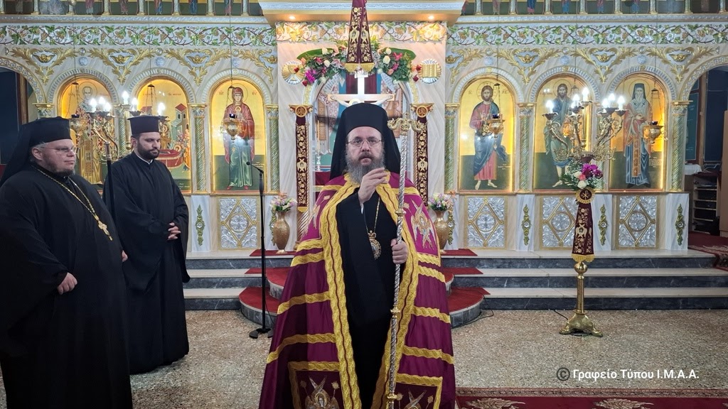 Κατά την σύντομη ομιλία του ο Σεβασμιώτατος αναφέρθηκε στο σταυροαναστάσιμο περιεχόμενο της Ακολουθίας του Εσπερινού «που μεταφέρει τον άνθρωπο, τον κάθε πιστό από τον Γολγοθά στο Κενό Μνημείο και από τον Σταυρό στην Ανάσταση, γιατί μέσα στην ορθόδοξη διδασκαλία δεν μπορεί να υπάρξει Σταυρός που να μην οδηγεί στην Ανάσταση, αλλά ούτε και Ανάσταση χωρίς να έχει προηγηθεί ο Σταυρός. Και η ακολουθία σήμερα τόνισε την υψίστη σημασία που έχει για την ζωή του ανθρώπου η σταυρική θυσία του Κυρίου μας μέσα από την οποία προσφέρθηκε η λύτρωση και η σωτηρία στο γένος των ανθρώπων, μέσα από την οποία νικήθηκε ο θάνατος, καταργήθηκε ο άδης και ο άνθρωπος πλέον ελεύθερος από τα δεσμά της αμαρτίας μπορεί να ελπίζει στην πασχάλια εμπειρία του αναστασίμου φωτός, να βιώσει δηλαδή την χαρά της Αναστάσεως, να καταυγαστεί η ζωή του από το ανέσπερο φως που πηγάζει από το κενό μνημείο».