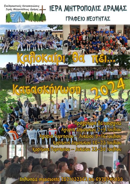 Την Κυριακή των Μυροφόρων 19 Μαΐου ξεκινούν οι εγγραφές για τις φετινές Κατασκηνώσεις της Μητροπόλεως Δράμας στην Εξοχή Κάτω Νευροκοπίου Δράμας.